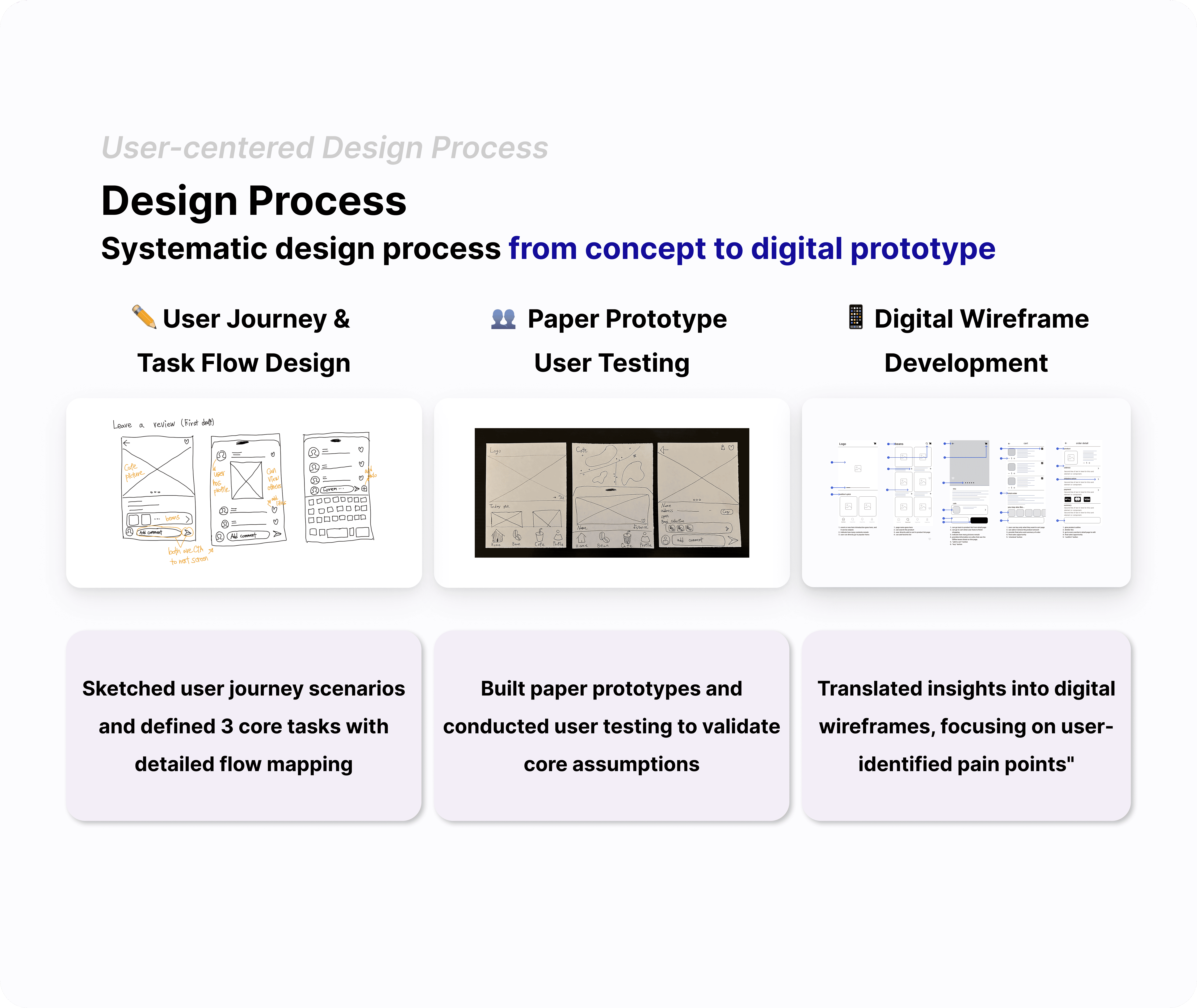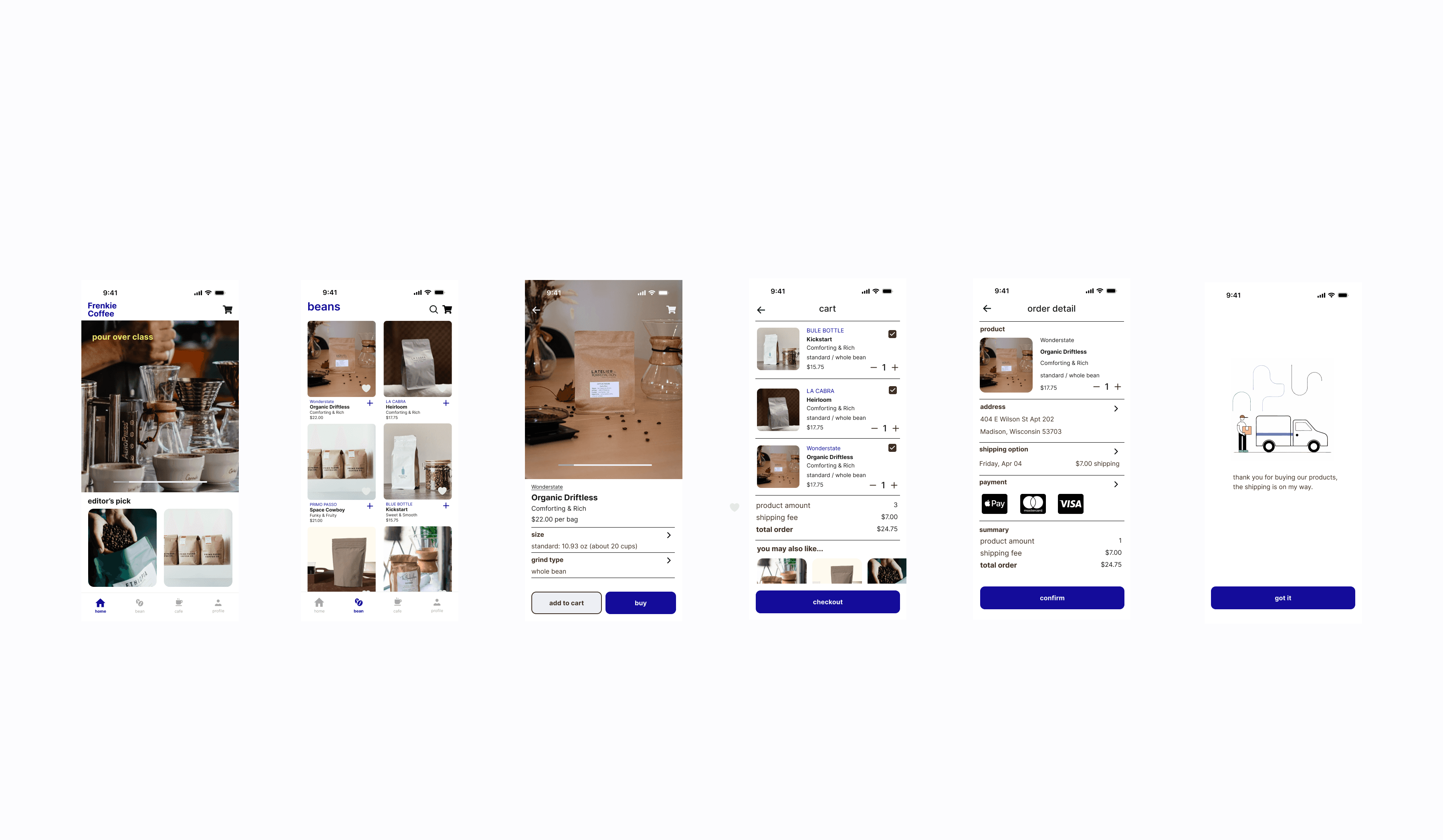 Information Hierarchy: Brand name → Product name(large) → Bean taste → Price